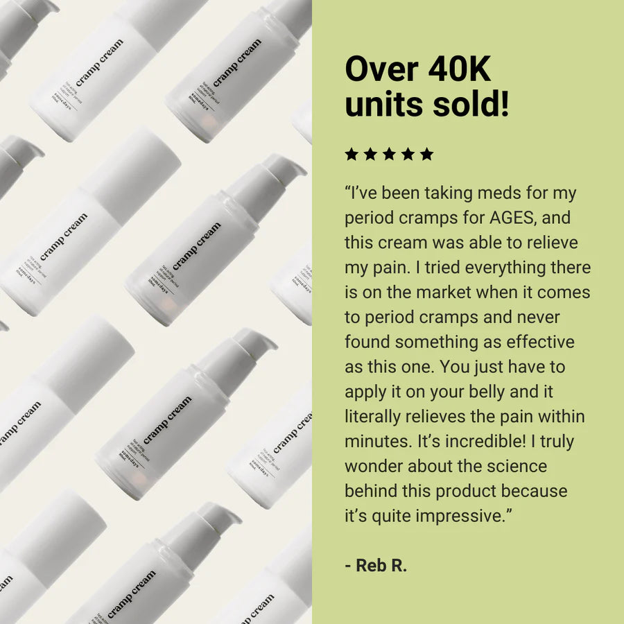 Ease period cramps instantly with Somedays's plant-based Cramp Cream. Formulated with natural active ingredients that address period discomfort at the root cause, making it an excellent alternative to traditional methods. Cramp Cream lasts up to 3 hours and can be reapplied as needed, anywhere you experience period discomfort.