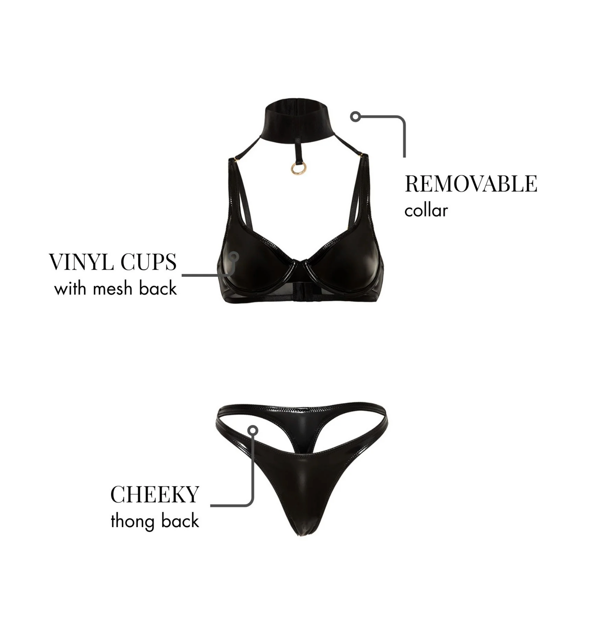Take a walk on the wild side with Fetish Lady M Bra Set! Use it to elevate your daily style or to add a daring twist later on. The adjustable underwire bra provides support and can be discreetly worn under any top. The included thong panty and wide collar give off a bold, high-fashion vibe. Live life unapologetically and strap in for a thrilling adventure with this set!