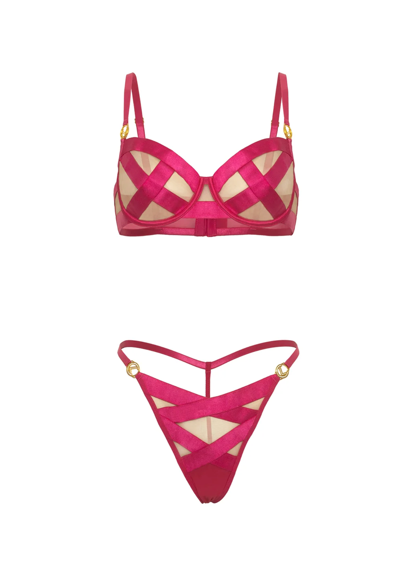 The Raelynn Set is set to excite all your senses this season. Luxurious satin crossing elastic wraps around the cup. The matching G-String is designed with a gold logo hardware detail that matches the bra.